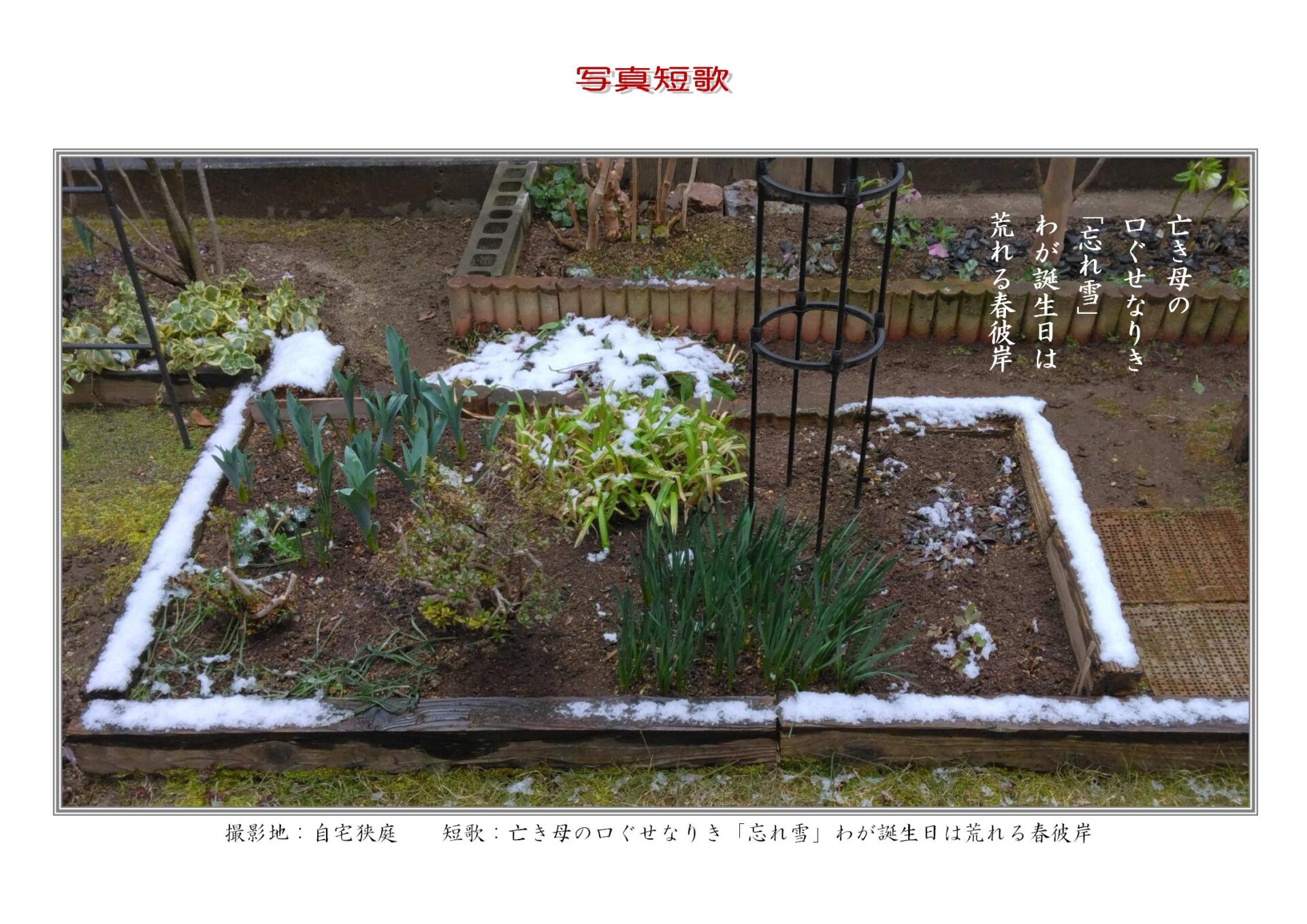いつもながら、昨晩から荒れ模様で朝起きたら雪が少し積もっており、                                                   かつて亡き母の口癖を思い出しながら次のような即詠(推敲未了)の                                               詠草と写真による写真短歌を調えたところです。